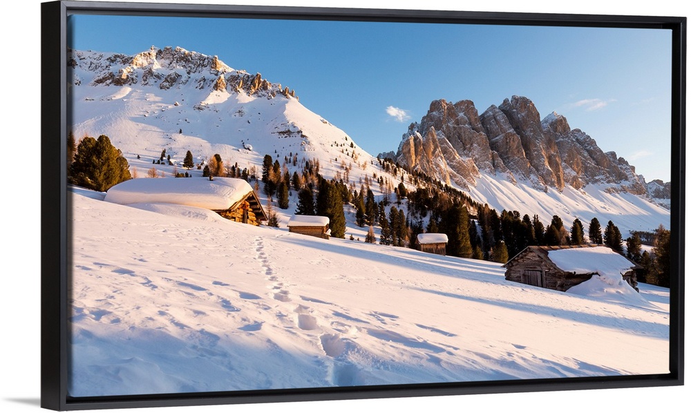 <p>A Beautiful Sunset On The Geisler In Villnoss With A Group Of Mountain Huts In The Foreground, Bolzano Province, South Tyrol, Trentino Alto Adige, Italy.</p>