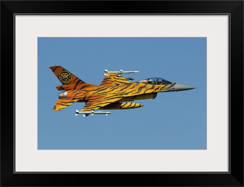 <p>A Belgian Air Component F-16 Fighting Falcon, painted in tiger colors for the NATO Tiger Meet, in flight with live AMRAAM and Sidewinder missiles.</p>