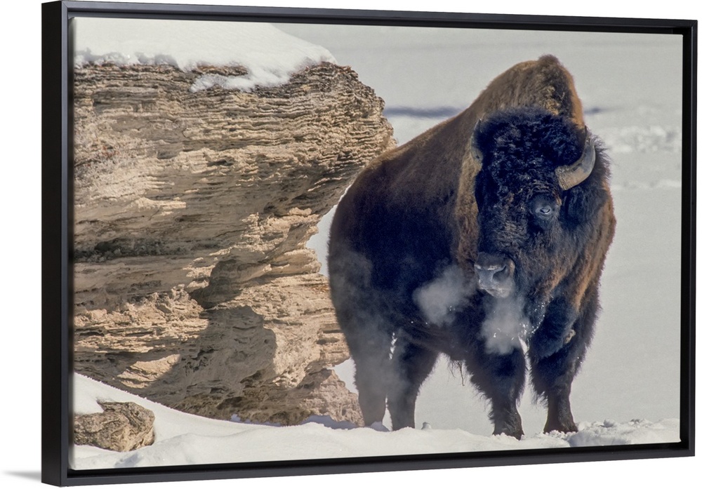 <p>A bison bull (Bison bison) soaks up the winter sun standing near a travertine rock to block the wind, close to the sunny south side of the Soda Butte Cone in Lamar Valley, Yellowstone National Park, Wyoming, United States of America. This bison bull was standing close to the sunny south side of the Soda Butte Cone. He was soaking up as much heat as he could by standing broadside to the sun and using the bare travertine rock as a reflector and wind block. I timed my.photograph to catch the plumes of breath from his nostrils as he exhaled in.the below-zero cold.</p>