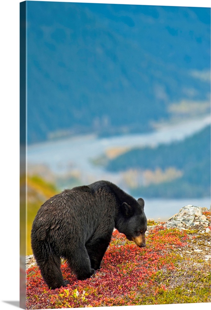 <p>A black bear foraging for berries near the Harding Icefield Trail at Exit Glacier on a fall day in Kenai Fjords National Park near Seward Alaska. Resurrection Valley is in the background.</p>