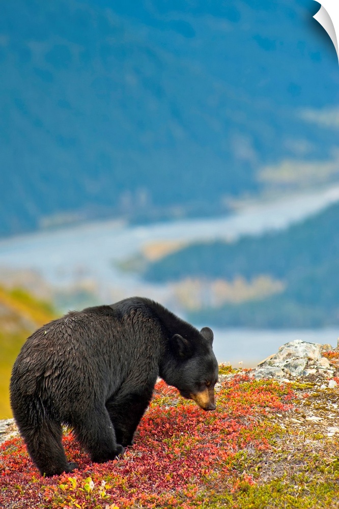 <p>A black bear foraging for berries near the Harding Icefield Trail at Exit Glacier on a fall day in Kenai Fjords National Park near Seward Alaska. Resurrection Valley is in the background.</p>