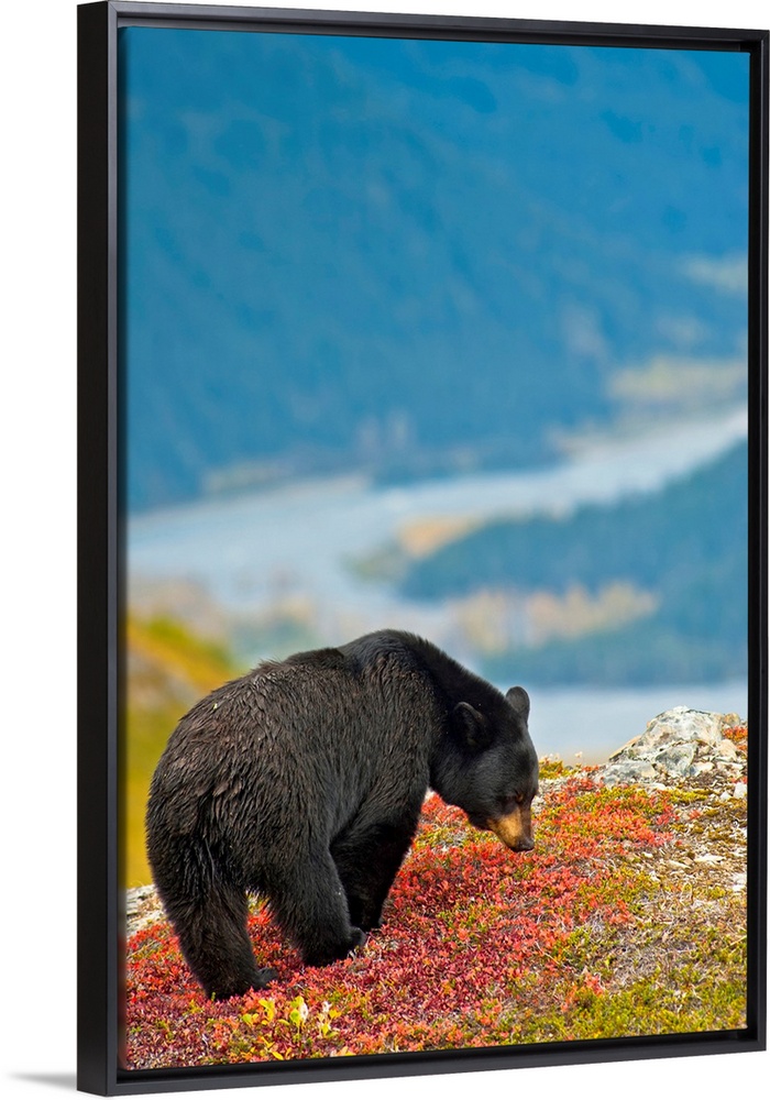<p>A black bear foraging for berries near the Harding Icefield Trail at Exit Glacier on a fall day in Kenai Fjords National Park near Seward Alaska. Resurrection Valley is in the background.</p>