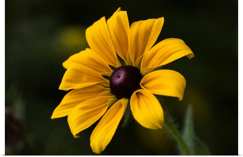 <p>A black-eyed Susan (rudbeckia hirta) blooms in a flower garden in summertime, Astoria, Oregon, united states of America.</p>