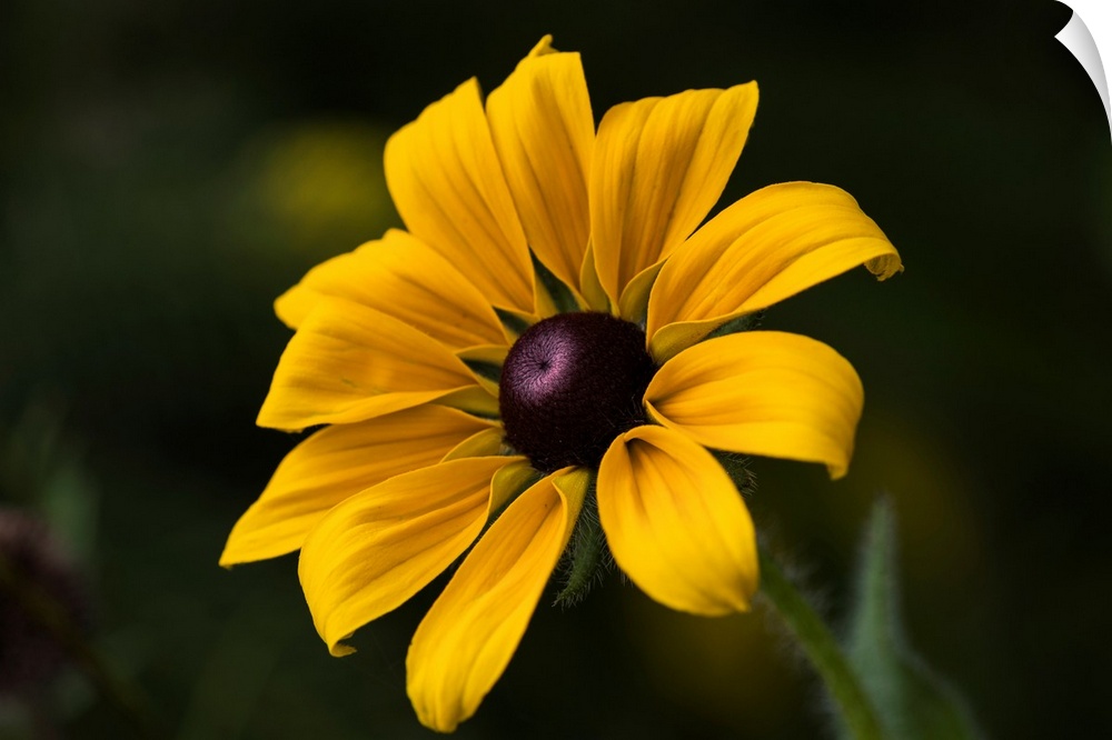 <p>A black-eyed Susan (rudbeckia hirta) blooms in a flower garden in summertime, Astoria, Oregon, united states of America.</p>