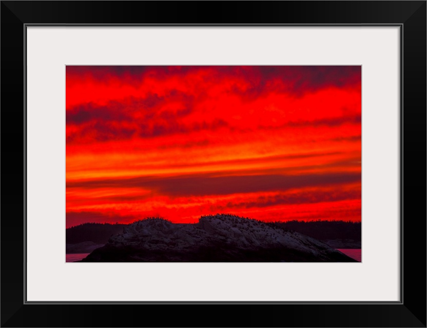 <p>A Blazing Red Sky At Sunset Silhouettes Hundreds Of Commorant Seabirds On A Rocky Island As Seen From The High Head Trail; Prospect, Nova Scotia, Canada</p>