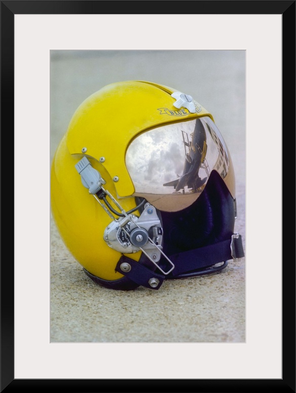 <p>A Blue Angels pilot helmet with aircraft reflection in visor.</p>