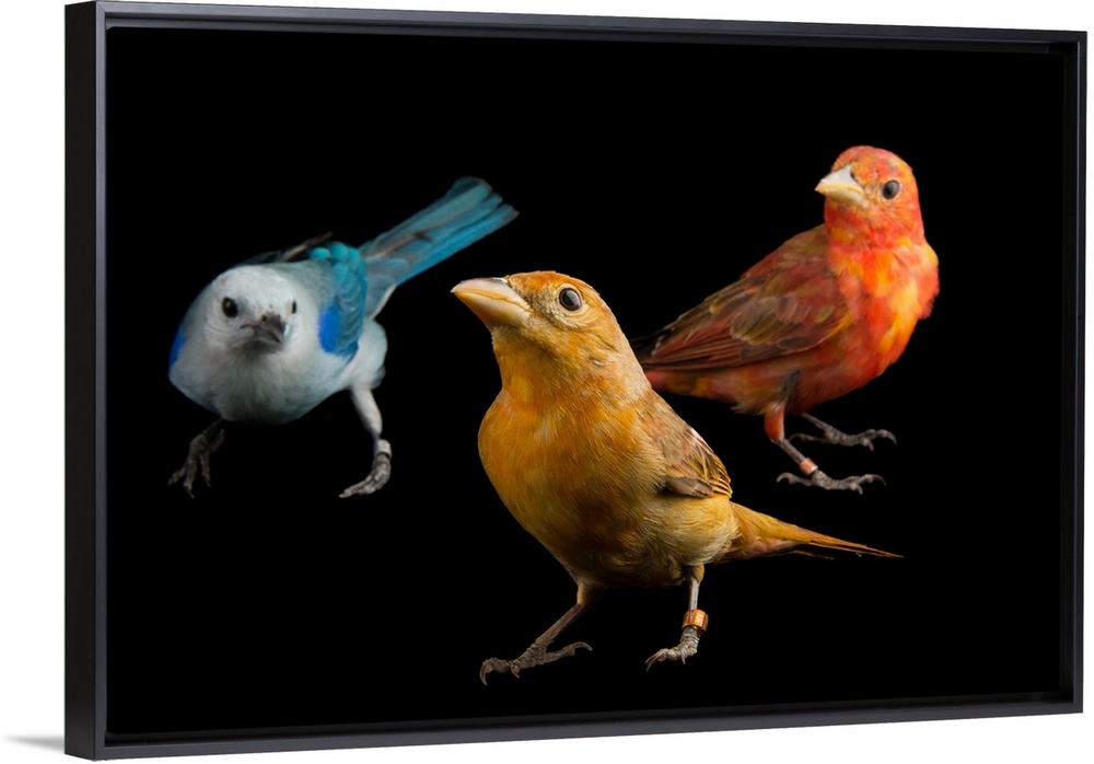 <p>A blue-grey tanager, Thraupis episcopus, and two hepatic tanagers, Piranga flava, at the National Aviary of Colombia.</p>