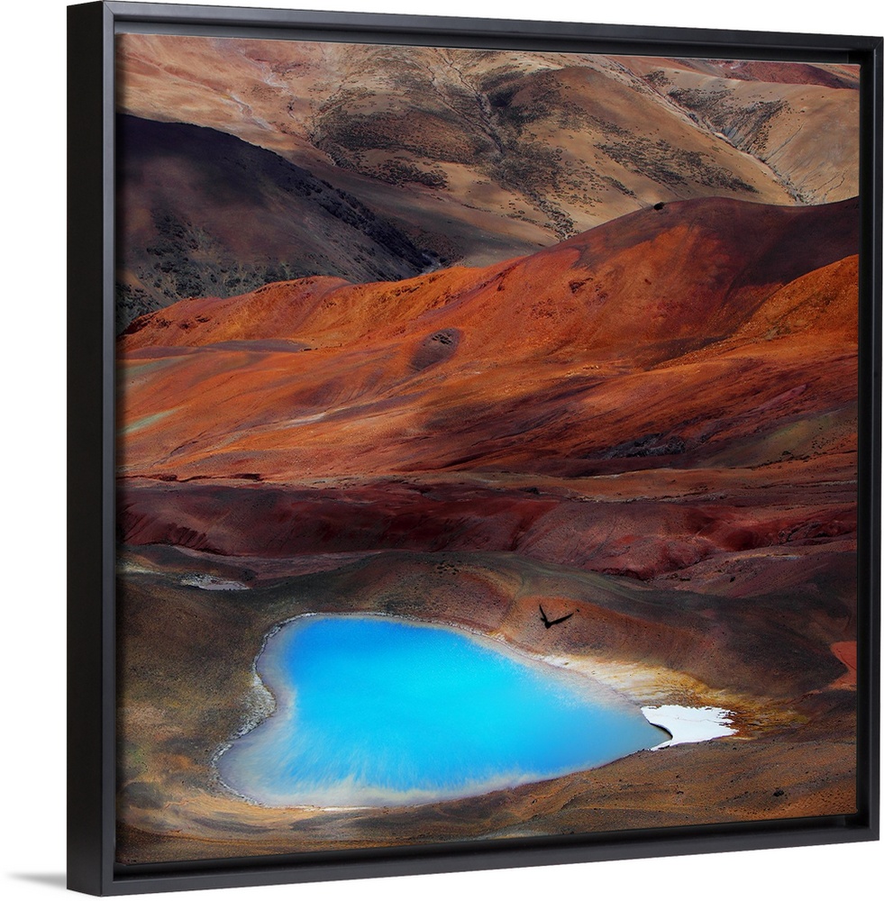 <p>A bright blue heart-shaped lake contrasts with the orange hills of the surrounding desert.</p>