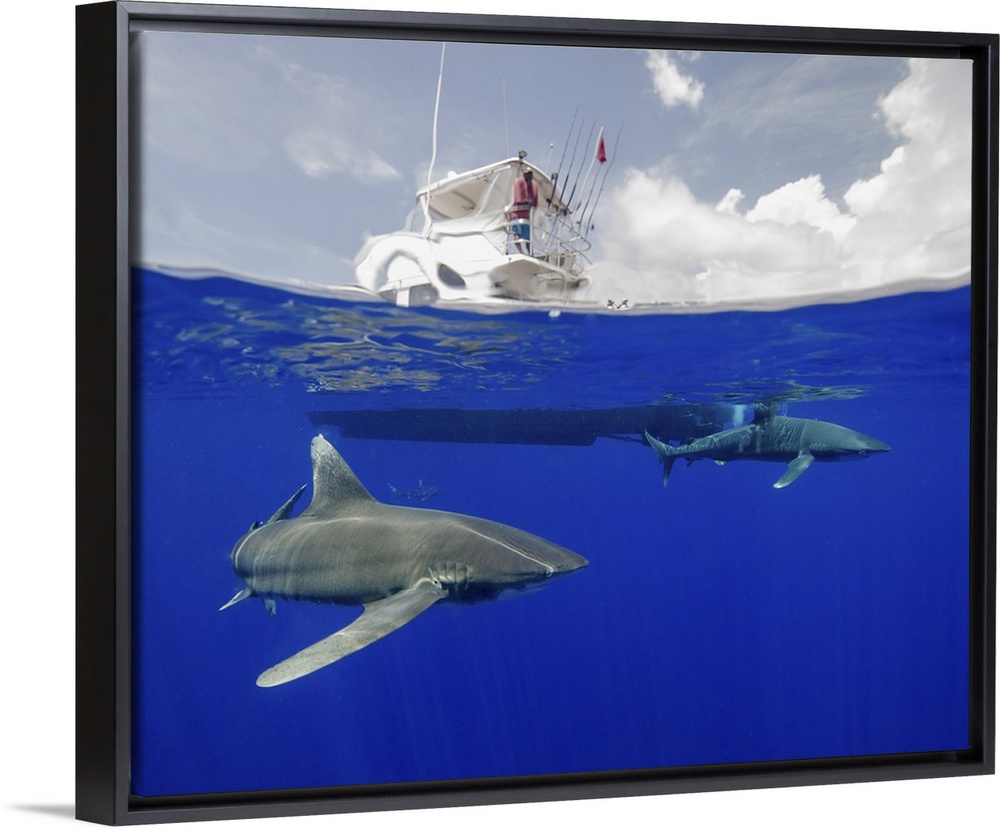<p>A boat captain watches an oceanic white tip shark below at Cat Island in the Bahamas.</p>