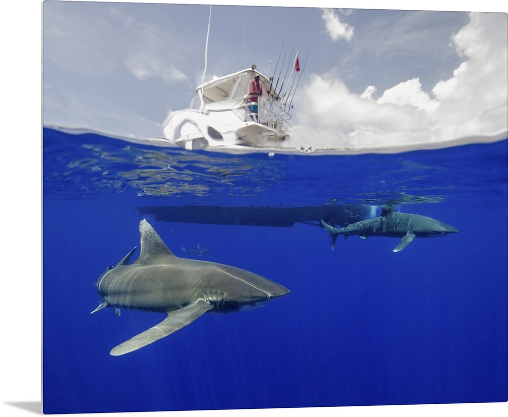 <p>A boat captain watches an oceanic white tip shark below at Cat Island in the Bahamas.</p>