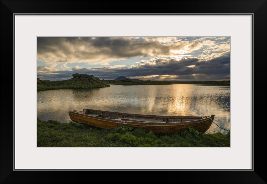 <p>A boat lies in a placid Lake Myvatn, North Iceland at sunset, Iceland</p>