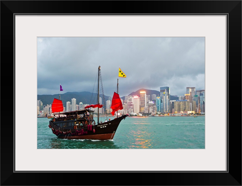 <p>A boat named Aqualuna in Victoria Harbor with the Hong Kong skyline in the distance.</p>