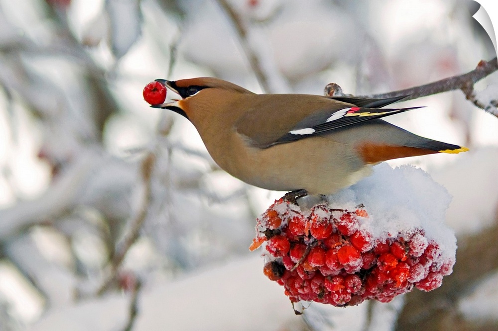<p>Landscape photograph on a large canvas of a Bohemian waxwing bird feeding on mountain ash berries as he perches on a snow covered bunch of them, in Anchorage, Southcentral Alaska. The background is an out of focus, winter landscape.</p>