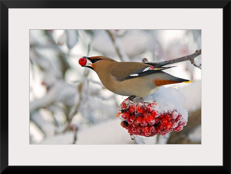 <p>Landscape photograph on a large canvas of a Bohemian waxwing bird feeding on mountain ash berries as he perches on a snow covered bunch of them, in Anchorage, Southcentral Alaska. The background is an out of focus, winter landscape.</p>