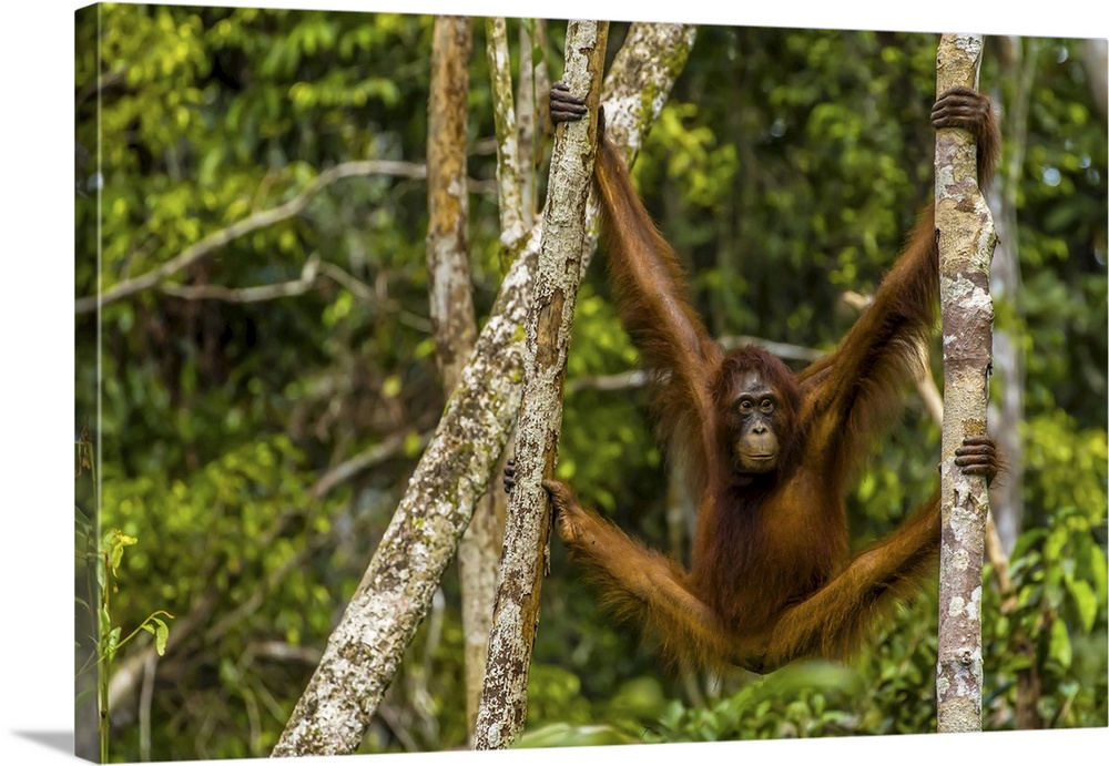 <p>A Bornean orangutan, Pongo pygmaeus, swinging from adjacent tree trunks.</p>
