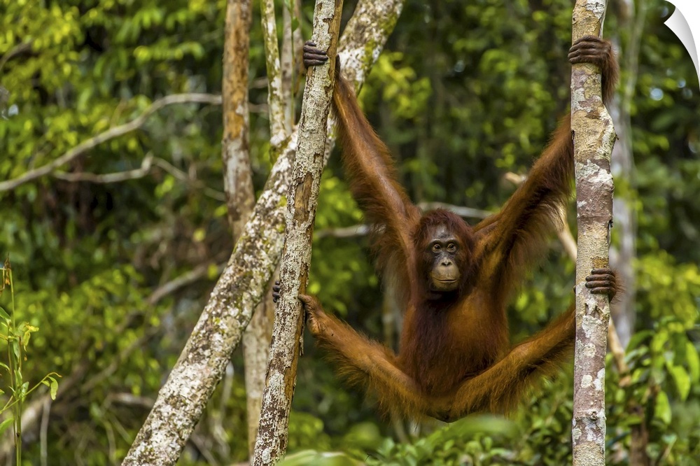 <p>A Bornean orangutan, Pongo pygmaeus, swinging from adjacent tree trunks.</p>