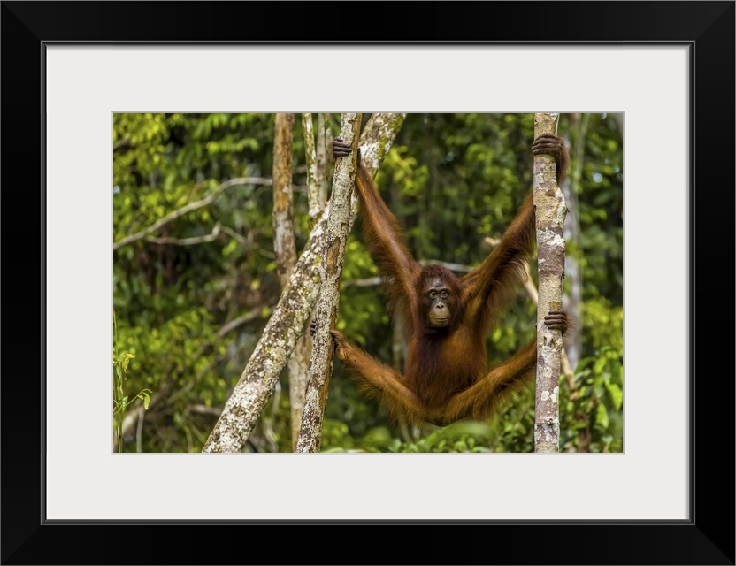 <p>A Bornean orangutan, Pongo pygmaeus, swinging from adjacent tree trunks.</p>