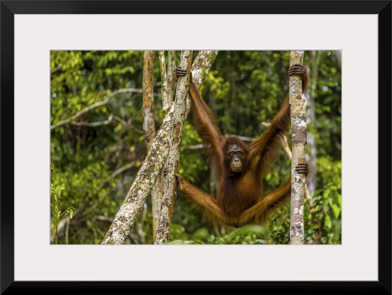 <p>A Bornean orangutan, Pongo pygmaeus, swinging from adjacent tree trunks.</p>
