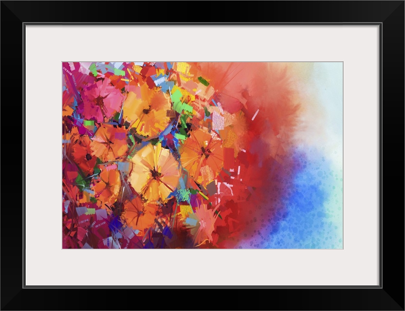 <p>Originally an abstract oil painting a bouquet of gerbera flowers . Close-up still life of red color flowers with soft red and blue color background. Originally hand painted florals in an impressionist style.</p>