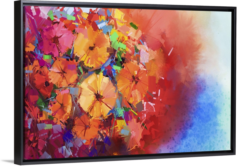 <p>Originally an abstract oil painting a bouquet of gerbera flowers . Close-up still life of red color flowers with soft red and blue color background. Originally hand painted florals in an impressionist style.</p>