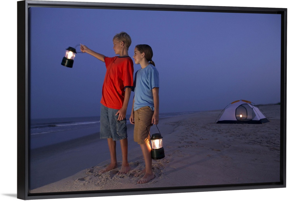 <p>A boy and a girl stand with lanterns on the beach with a tent in the background</p>