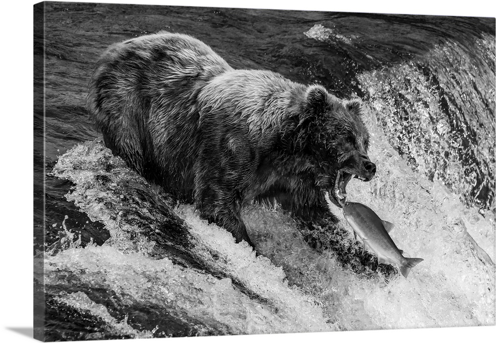 <p>A brown bear (Ursus arctos) about to catch a salmon in its mouth at the top of Brooks Falls, Alaska. The fish is only a few inches away from its gaping jaws. Shot with a Nikon D800 in Alaska; Kodiak, Alaska, United States of America.</p>