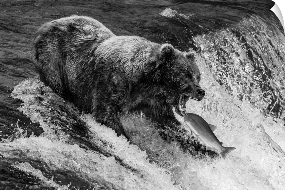 <p>A brown bear (Ursus arctos) about to catch a salmon in its mouth at the top of Brooks Falls, Alaska. The fish is only a few inches away from its gaping jaws. Shot with a Nikon D800 in Alaska; Kodiak, Alaska, United States of America.</p>