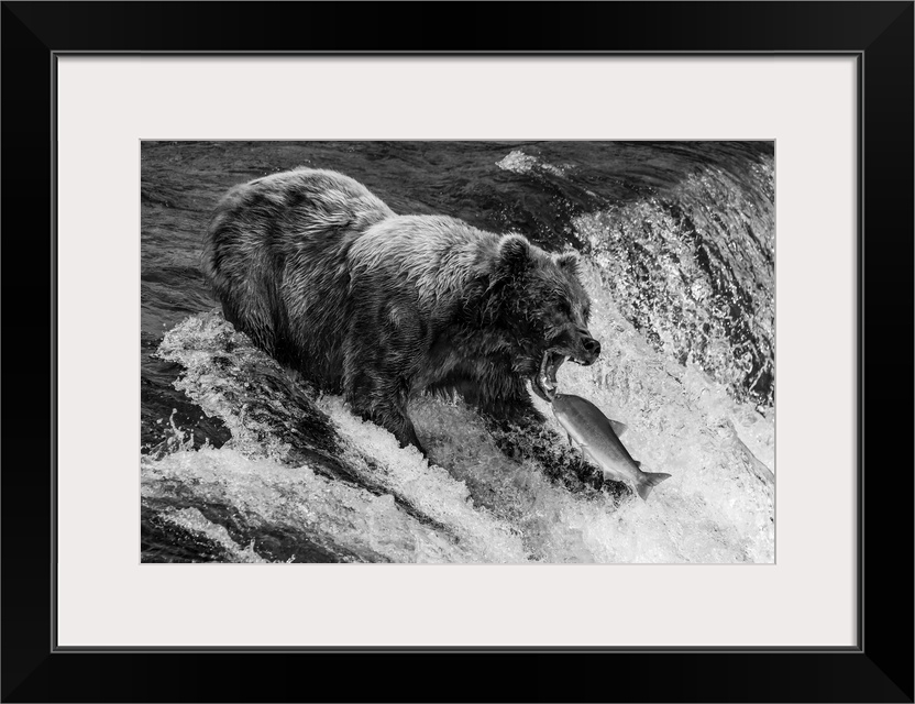 <p>A brown bear (Ursus arctos) about to catch a salmon in its mouth at the top of Brooks Falls, Alaska. The fish is only a few inches away from its gaping jaws. Shot with a Nikon D800 in Alaska; Kodiak, Alaska, United States of America.</p>