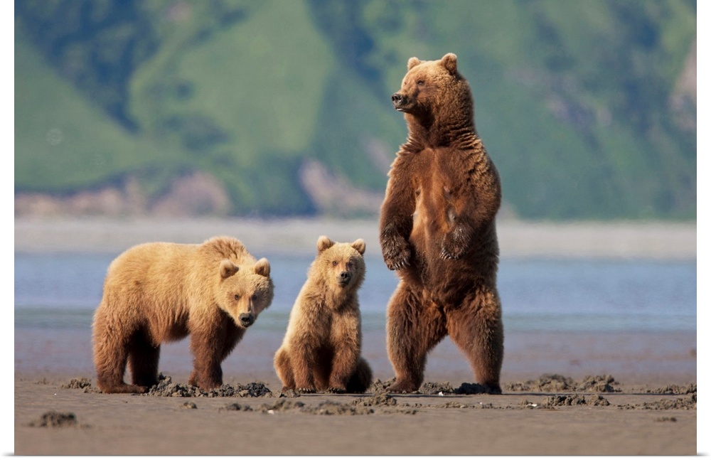 <p>A brown bear mother and cubs walks across mudflats in Kaguyak Bay, Katmai Coast, Alaska.</p>