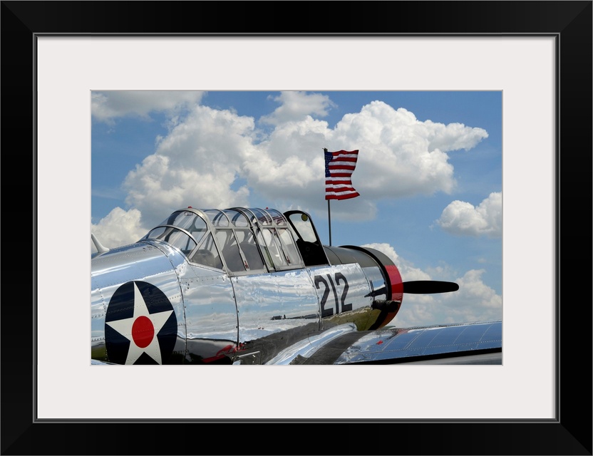 <p>A BT-13 Valiant trainer aircraft with American Flag.</p>