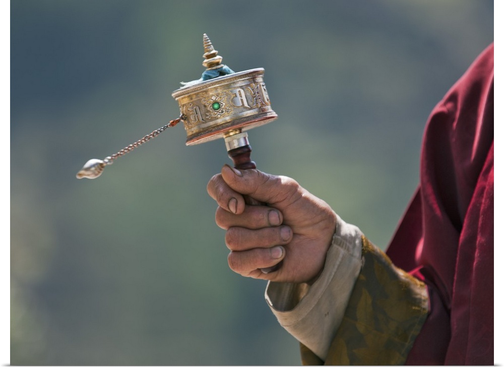 <p>A Buddhist spins his hand-held prayer wheel in a clockwise direction with the help of a weighted chain attached to it. Each turn is the equivalent of reading the prayers or mantras within.</p>