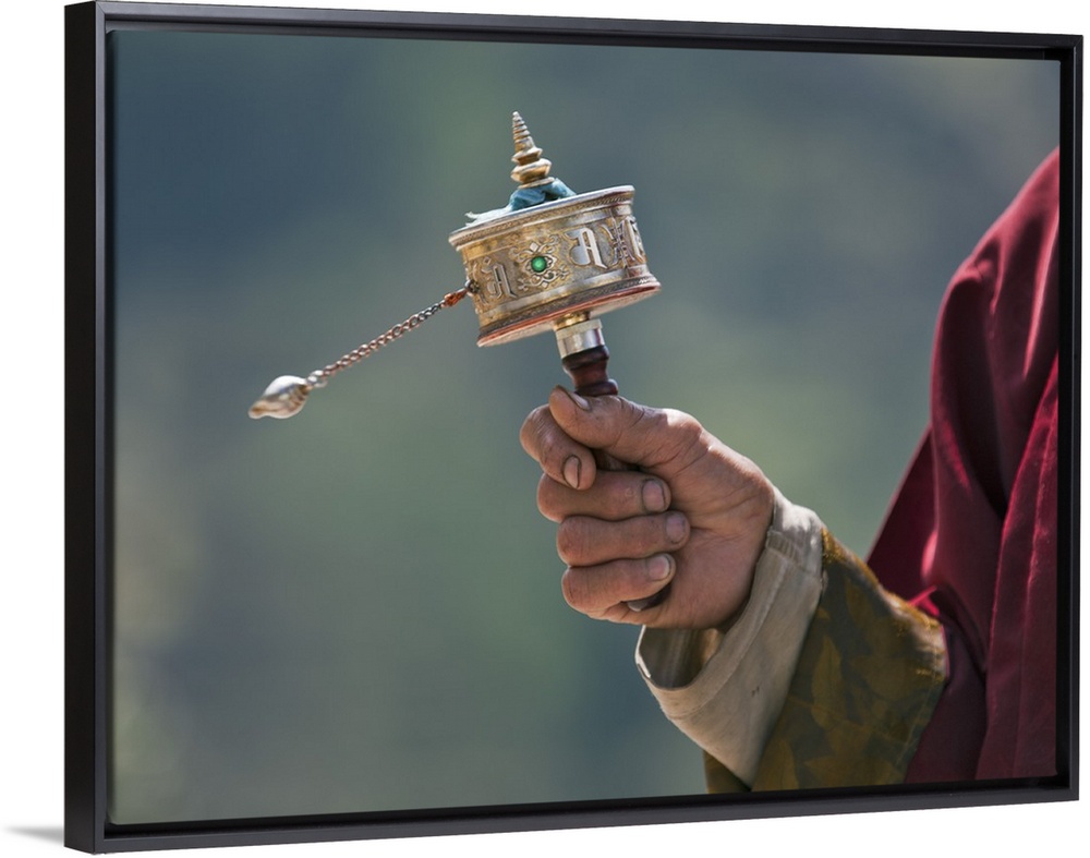 <p>A Buddhist spins his hand-held prayer wheel in a clockwise direction with the help of a weighted chain attached to it. Each turn is the equivalent of reading the prayers or mantras within.</p>