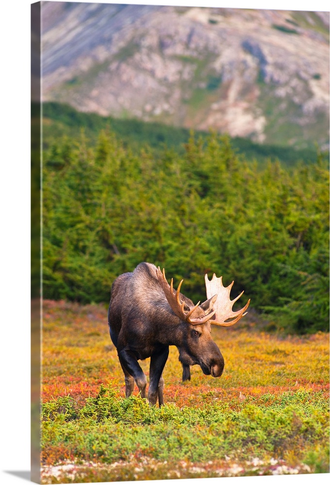 <p>A bull moose in rut standing on tundra in front of a wooded area near Powerline Pass in Chugach State Park on a fall day. Anchorage Alaska.</p>