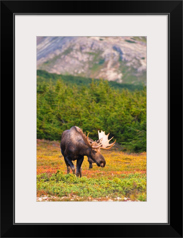 <p>A bull moose in rut standing on tundra in front of a wooded area near Powerline Pass in Chugach State Park on a fall day. Anchorage Alaska.</p>