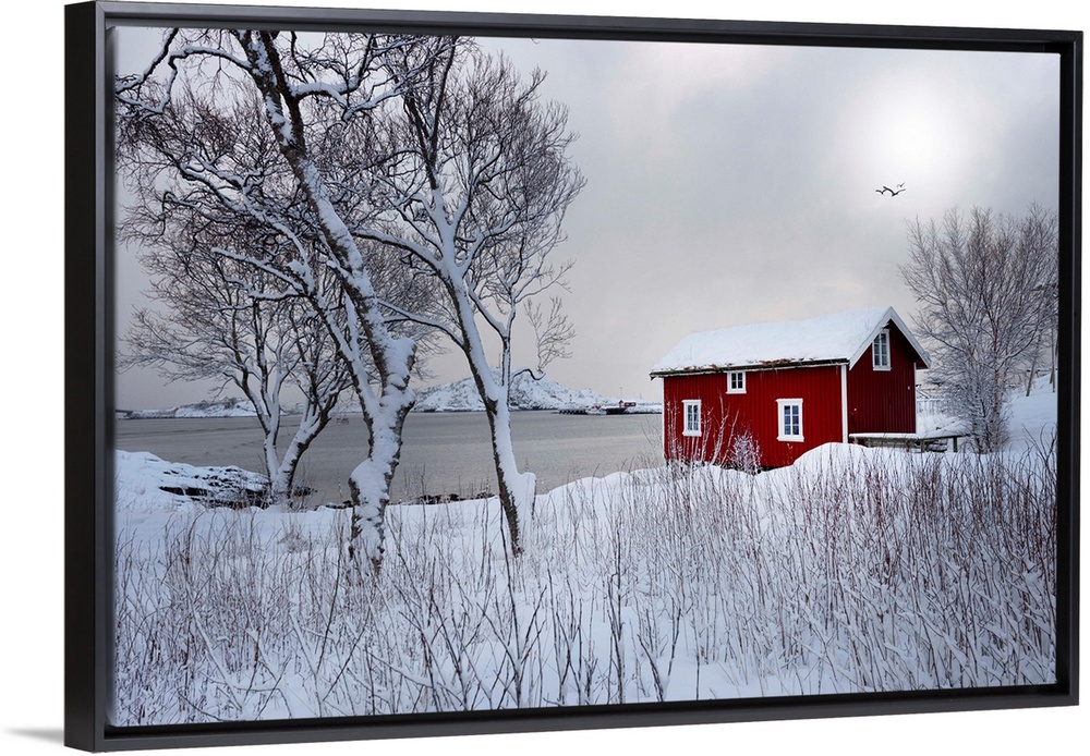 <p>A photograph of a red building sitting on the shoreline of a snowy landscape with mountains in the distance.</p>