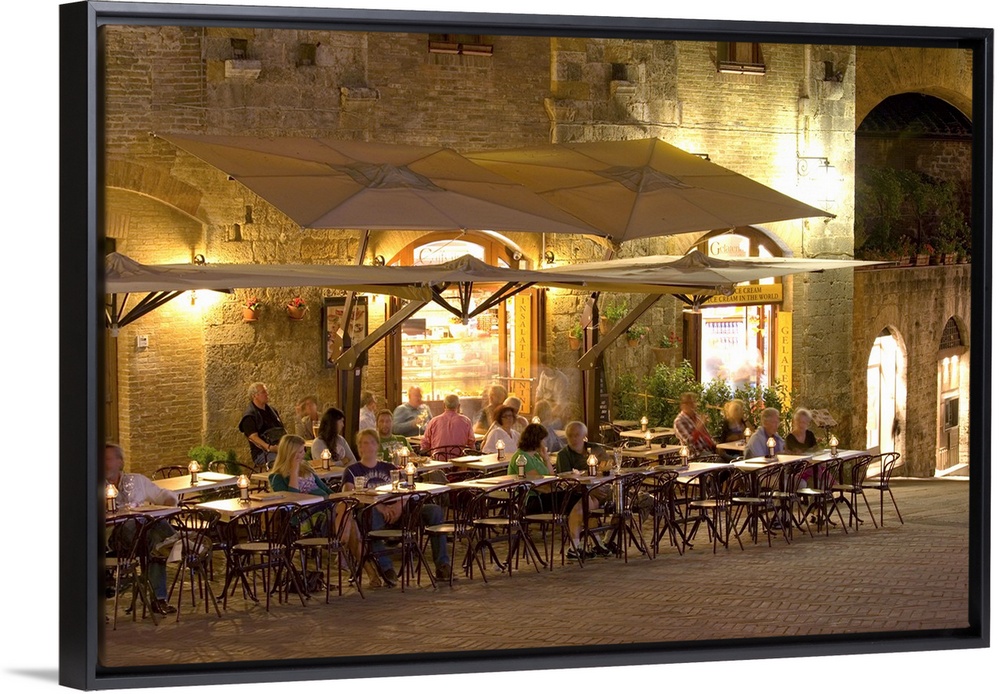 <p>Pavement cafe illuminated by night, Piazza della Cisterna, San Gimignano, Siena, Toscana, Italy, Europe. The Historic Centre of San Gimignano was added to the UNESCO World Heritage List in 1990.</p>