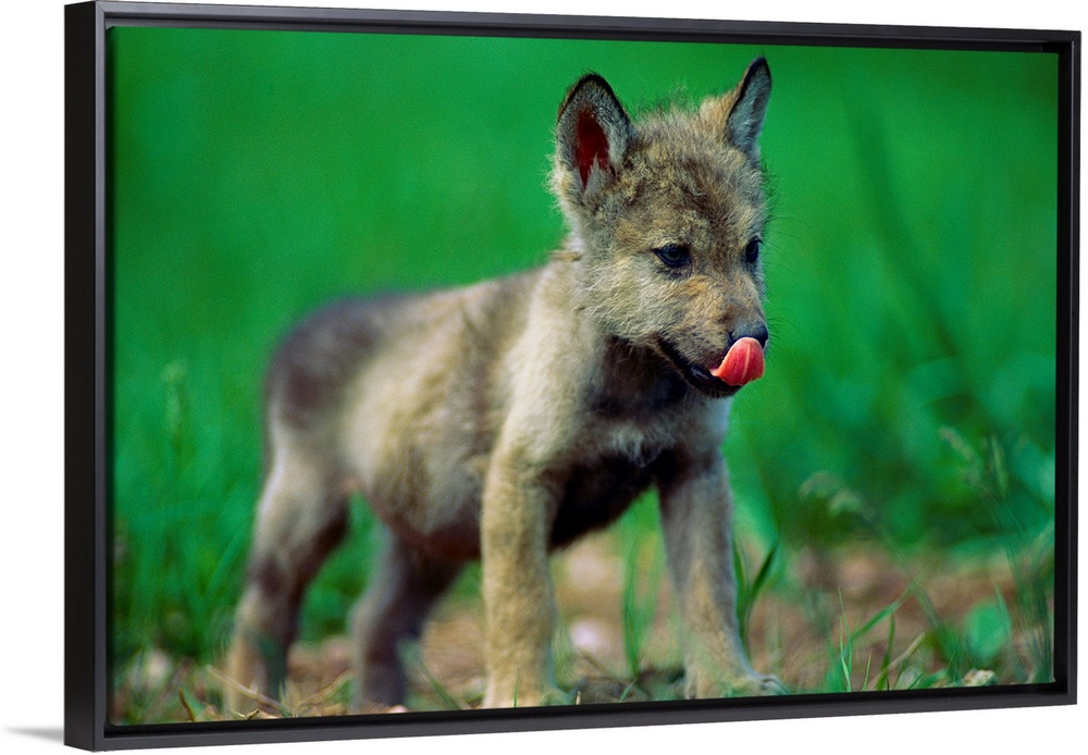 <p>Horizontal photograph from the National Geographic Collection of a tiny, gray wolf cub licking its nose as it stands in the grass, in Rapid City, South Dakota.</p>
