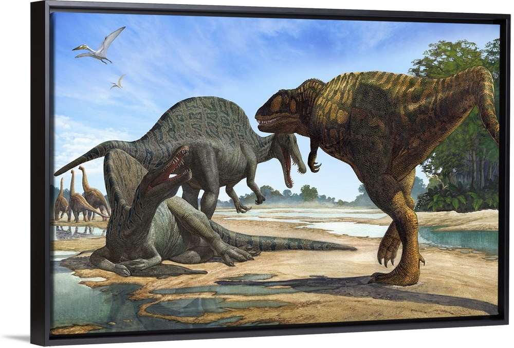 <p>A Carcharodontosaurus invades the territory of two Spinosaurus dinosaurs.</p>