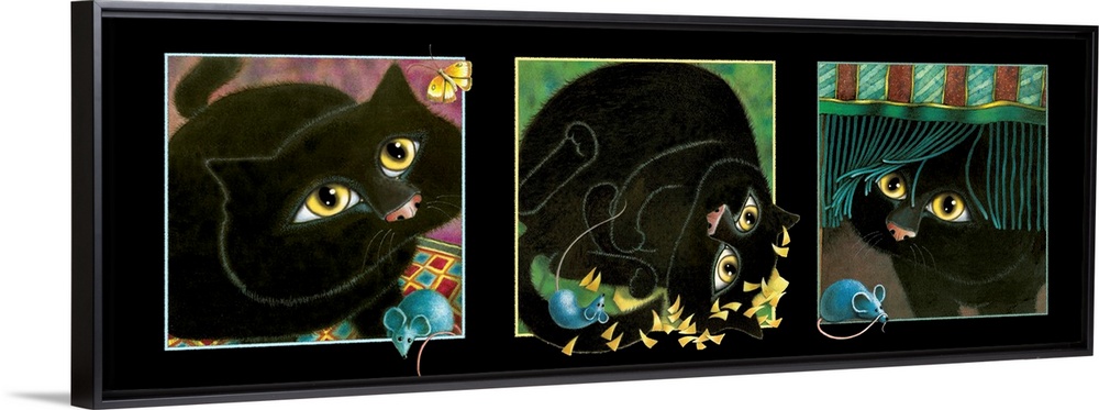 <p>Panoramic painting that has three square with a black cat and blue mouse in each.</p>