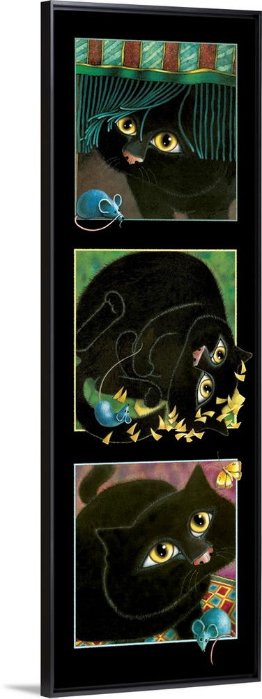<p>Panoramic painting that has three square with a black cat and blue mouse in each.</p>