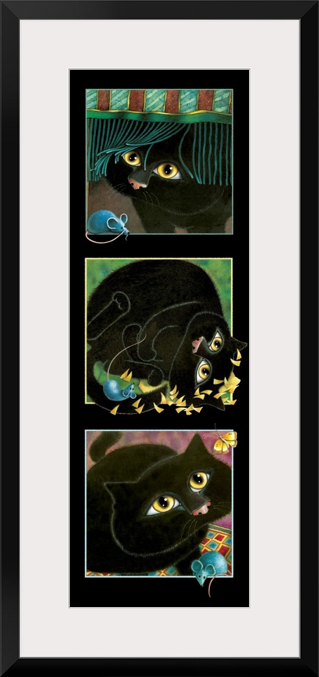 <p>Panoramic painting that has three square with a black cat and blue mouse in each.</p>