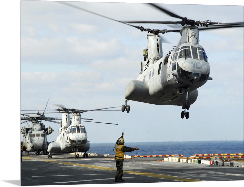 <p>Sea of Japan, March 18, 2011 - A CH-46E Sea Knight helicopter takes off from the flight deck of the forward-deployed amphibious assault ship USS Essex (LHD-2). Essex, the amphibious dock landing ships USS Harpers Ferry (LSD-49) and USS Germantown (LSD-42) are off the coast of Akita Prefecture, Japan, awaiting further tasking in support of Operation Tomodachi.</p>