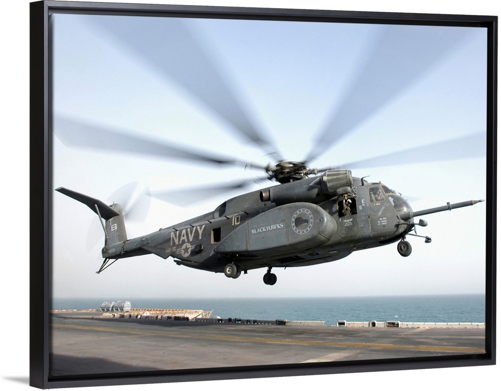 <p>A CH-53 Sea Stallion helicopter leaves the flight deck of USS Kearsarge.</p>