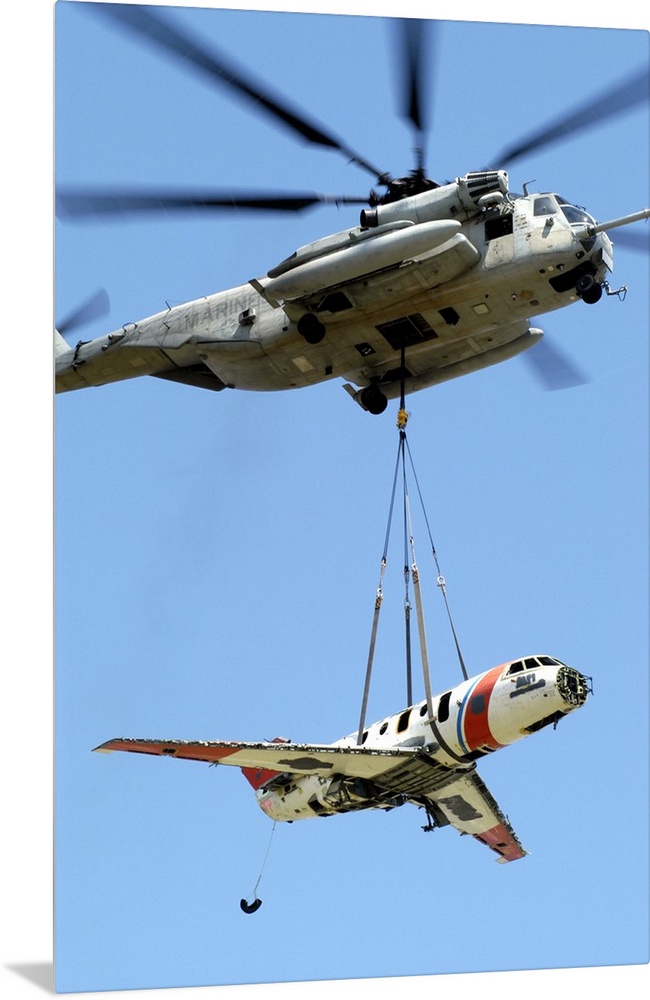 <p>A CH-53 Sea Stallion lifts a HU-25 Guardian Coast Guard aircraft.</p>