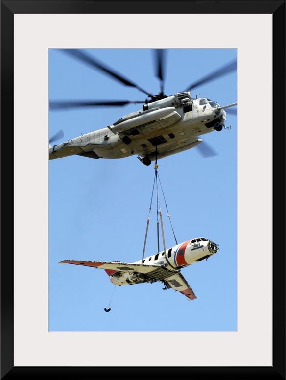 <p>A CH-53 Sea Stallion lifts a HU-25 Guardian Coast Guard aircraft.</p>