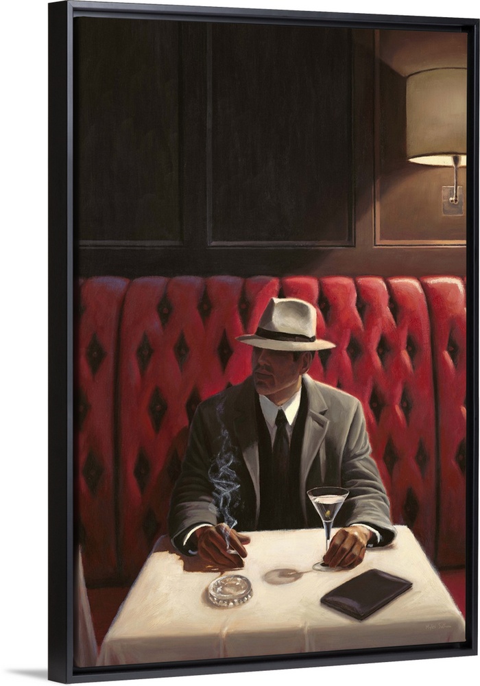 <p>Contemporary painting of a man at a restaurant looking sideways.</p>