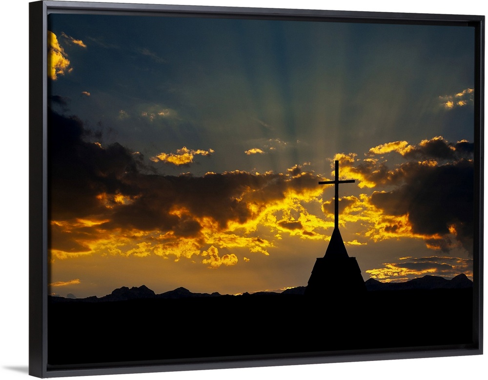 <p>Silhouette of a church steeple's cross against a dramatic colorful sky with silhouette mountain range in the background. Calgary, Alberta, Canada.</p>