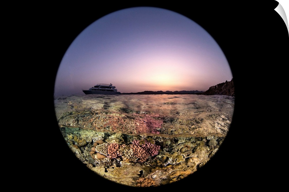 <p>A circular split shot of a boat on the water at sunset.</p>