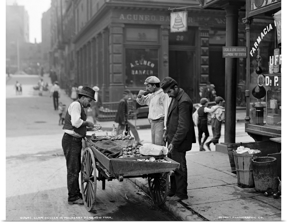 <p>A clam seller on Mulberry Bend in New York City. Photograph, c1900.</p>