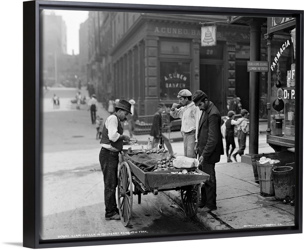 <p>A clam seller on Mulberry Bend in New York City. Photograph, c1900.</p>